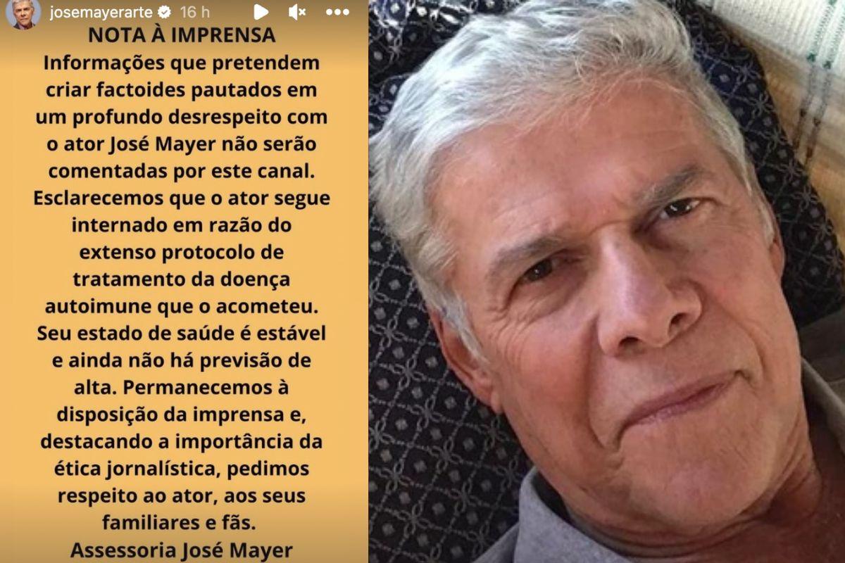 Na sessão de stories, iniciaram: “Informações que pretendem criar factoides pautados em um profundo desrespeito com o ator José Mayer não serão comentadas por este canal. Esclarecemos que o ator segue internado em razão do extenso protocolo de tratamento da doença autoimune que o acometeu”, colocaram em defesa pelo ator.