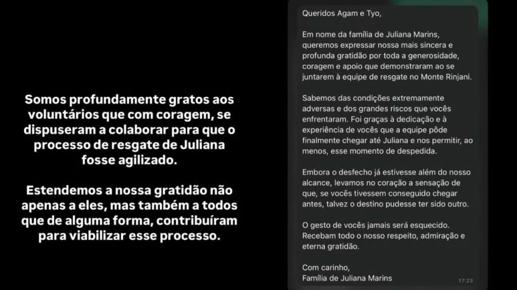 “Queridos Agam e Tyo, em nome da família de Juliana Marins, queremos expressar nossa mais sincera e profunda gratidão por toda a generosidade, coragem e apoio que demonstraram ao se juntarem à equipe de resgate no Monte Rinjani. Sabemos das condições extremamente adversas e dos grandes riscos que vocês enfrentaram… O gesto de vocês jamais será esquecido.”