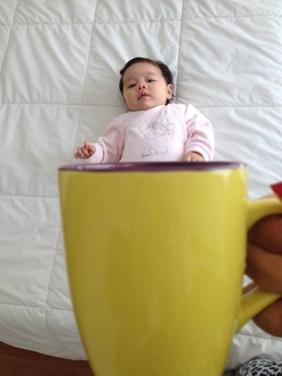 Passo 2) Segure uma caneca em frente ao seu bebê.