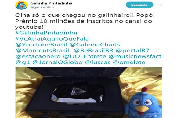 Sim, a Galinha Pintadinha completou o recorde de mais de 10 milhões de inscritos em seu canal no Youtube, ultrapassando a cantora Lady Gaga (9,5 milhões). O canal foi premiado pelo Youtube com a placa de diamante que apenas canais que chegam a essa marca conquistam.