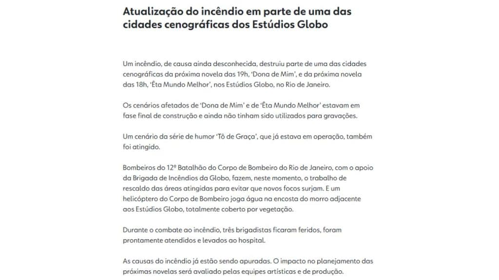 Na tarde da última terça-feira, 18 de fevereiro, um incêndio de grandes proporções atingiu uma das cidades cenográficas dos Estúdios Globo, no Rio de Janeiro, provocando sérios danos. O incidente, que afetou diretamente os cenários das novelas Dona de Mim e Êta Mundo Melhor, mobilizou equipes de bombeiros e brigadistas, e deixou três profissionais feridos. O fogo atingiu partes da estrutura ainda em construção e não utilizadas para gravações, gerando grande preocupação na emissora.