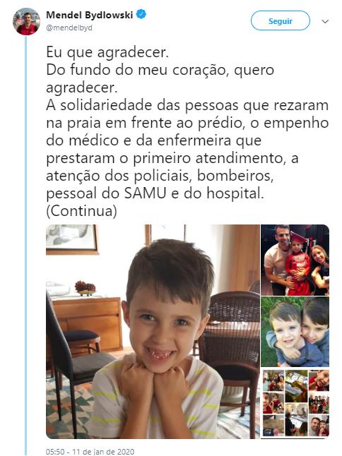“Eu que agradecer. Do fundo do meu coração, quero agradecer. A solidariedade das pessoas que rezaram na praia em frente ao prédio, o empenho do médico e da enfermeira que prestaram o primeiro atendimento, a atenção dos policiais, bombeiros, pessoal do SAMU e do hospital”, escreveu.