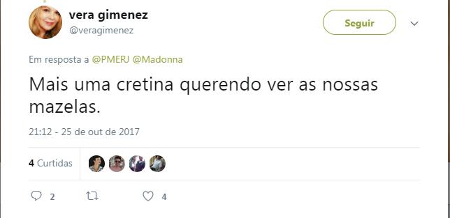 A polícia também foi bem criticada: “Servir e proteger a @Madonna e fácil quero ver servir e proteger a população.Ai é difícil né?”. “Vcs não tem vergonha de postar fotinho com estrelinha no momento caótico em que estamos vivendo?! Que escroto.”, escreveu outra.