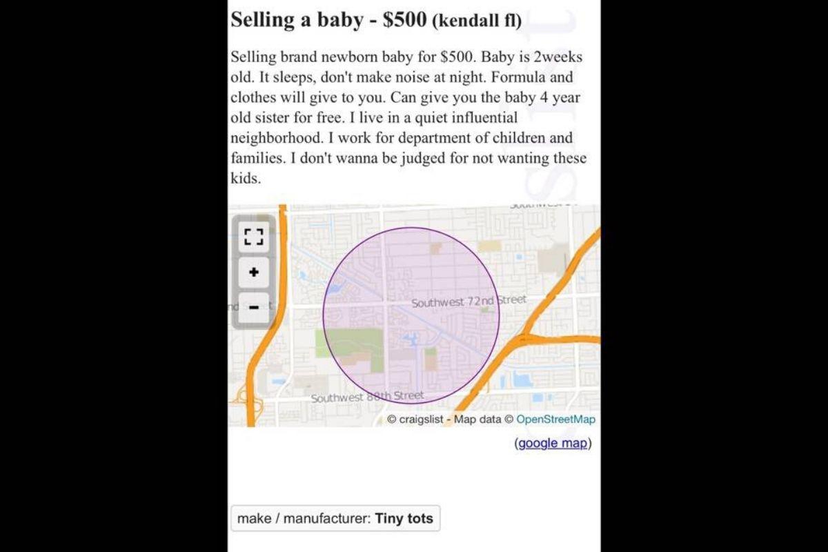 Na última sexta-feira, 22 de novembro, agentes de Miami estão investigando um anúncio suspeito, sobre a venda de um bebê no site Craigslist. O recém-nascido viria acompanhado também de uma criança e custariam US$ 500, o equivalente a R$ 2 mil aproximadamente.
