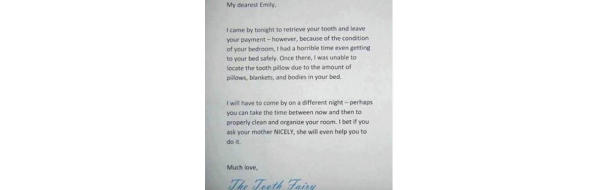 Se passando pela fada do dente, a mãe escreveu um bilhete explicando que ela foi incapaz de recuperar o dente e deixar o pagamento por causa da bagunça do quarto. A cartinha foi compartilhada no blog e no Facebook da mãe está fazendo sucesso. A mãe também publicou que seu plano deu certo. Emily e os irmão arrumaram o quarto para esperar a nova visita da fada do dente.
