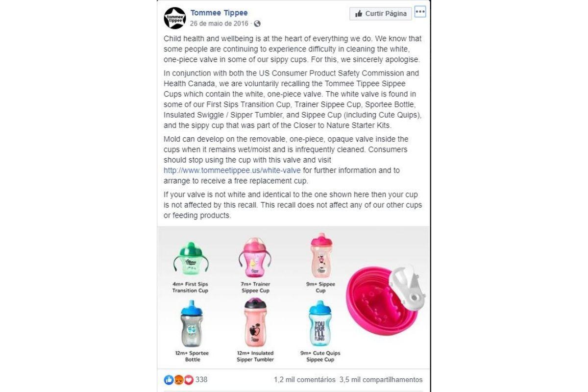 Os copos pertenciam à uma grande fabricante internacional de produtos voltados para bebês, a Tommee Tippee. No Facebook, a empresa se posicionou em uma nota. Leia o posicionamento na íntegra: “A saúde e o bem-estar das crianças está na alma do que fazemos. Sabemos que algumas pessoas têm tido dificuldades em limpar as tampas de alguns de nossos copos. Por isso, nós queremos dar nossas sinceras desculpas.