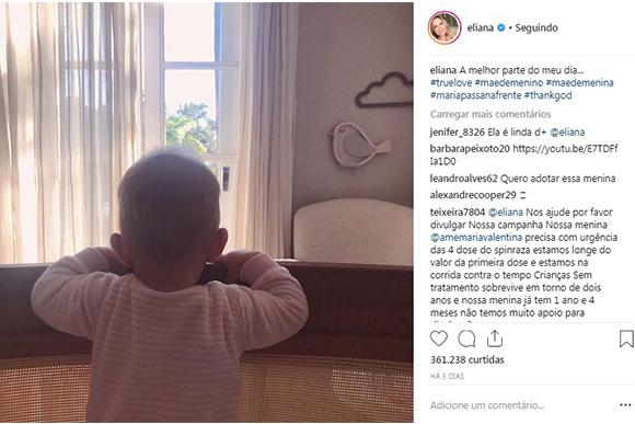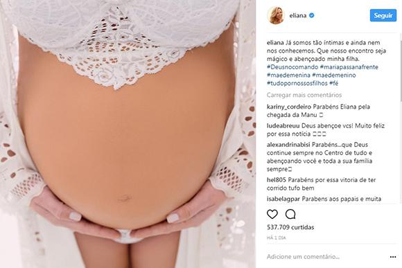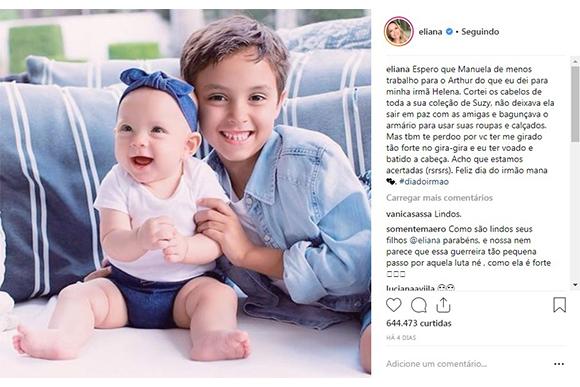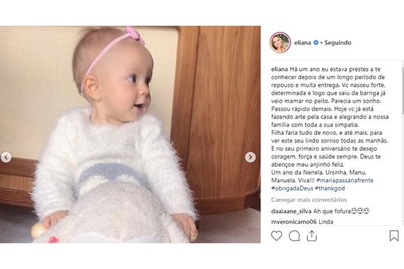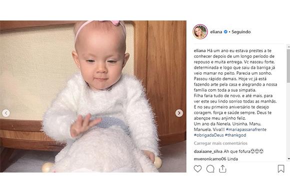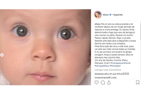 Eliana também aproveitou para lembrar as dificuldades que passou durante a gestação da caçula, quando teve descolamento de placenta e precisou ficar de repouso total para assegurar que a filha não nascesse antes da hora. “Filha faria tudo de novo, e até mais, para ver este seu lindo sorriso todas as manhãs. E no seu primeiro aniversário te desejo coragem, força e saúde sempre. Deus te abençoe meu anjinho feliz”, disse. A apresentadora também é mãe de Arthur, de 7 anos, de seu relacionamento com João Marcello Bôscolli.