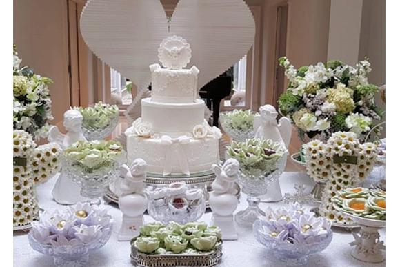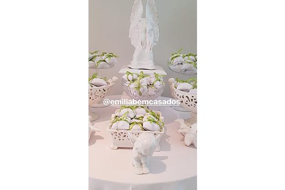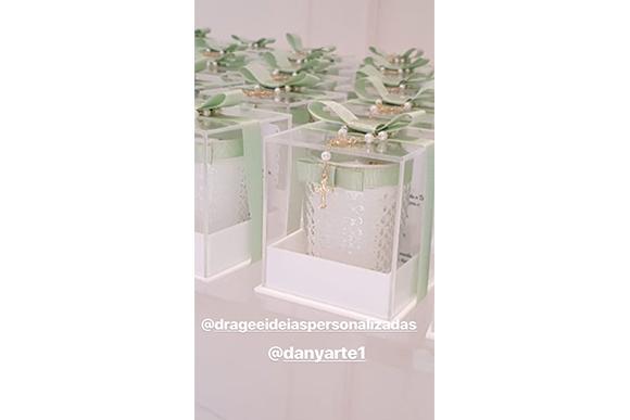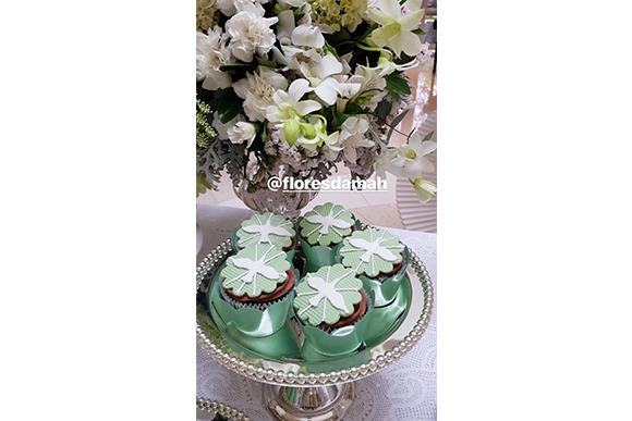 Em seu stories, a apresentadora compartilhou detalhes da decoração do almoço de comemoração, que aconteceu após a cerimônia. “Tudo tão lindo”, ela escreveu. Com a maioria dos enfeites na cor branca, alguns detalhes levaram tons de verde, como os doces e lembrancinhas.