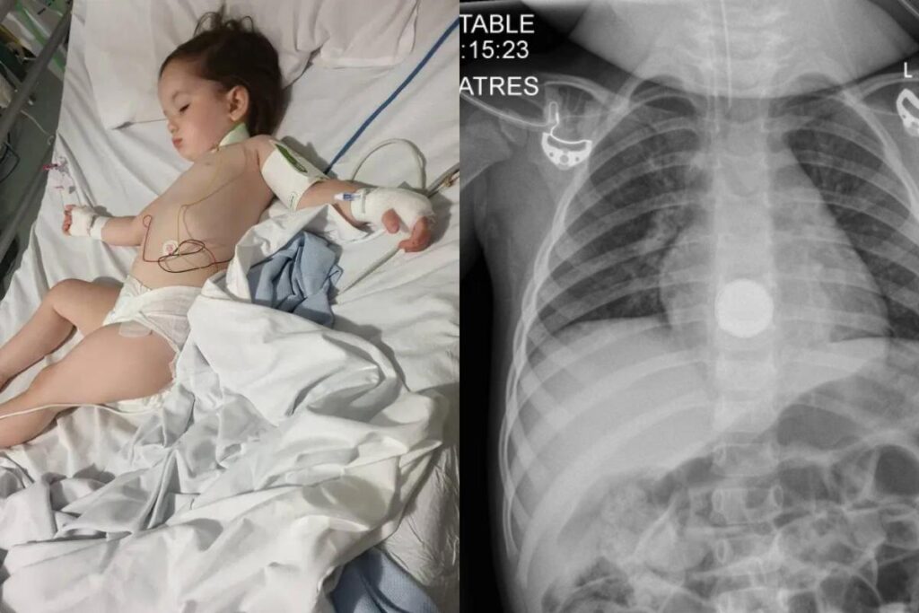 Uma criança foi levada para uma cirurgia às pressas depois que um raio-X mostrou que a menina tinha uma bateria dentro do corpo. Kirsty, de 29 anos, levou a filha Elsie-Rose Duffy para o hospital com fortes dores de estômago. Foi quando, os médicos encontraram a bateria presa perto do topo do esôfago da menina.