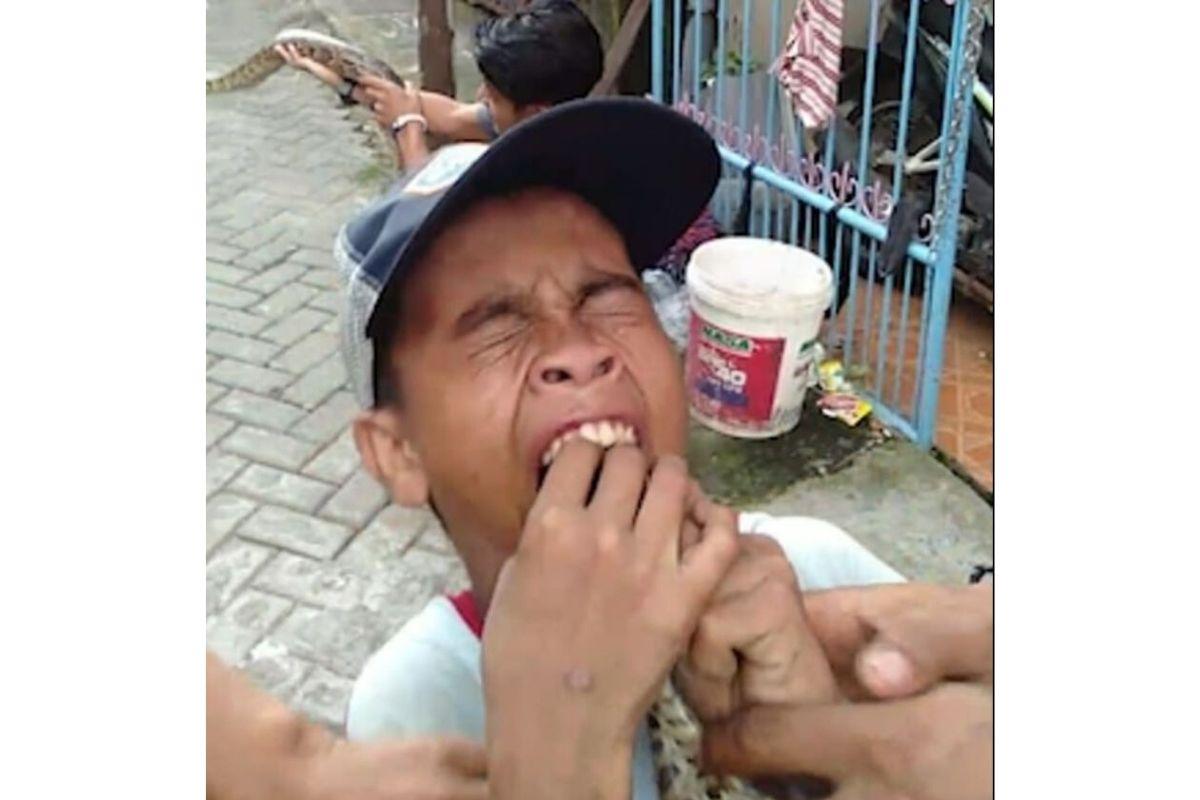 Em Massakar, na Indonésia, duas crianças estavam brincando com uma cobra píton e uma delas decidiu se arriscar e passou por um momento de desespero. O menino mostrou a língua para a cobra e o bicho instantaneamente picou o garoto.