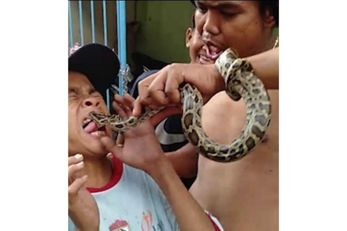 O menino entra em desespero e tenta tirar o réptil de sua língua, chorando enquanto as pessoas ao redor dão risada. Alguns segundos depois, a cobra se solta e o menino mais velho afasta o animal do mais novo.