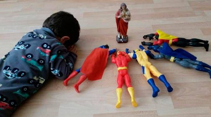 Pablo, um menino colombiano de 9 anos, não é diferente. Ele ficou famoso na internet depois de aparecer em uma foto onde está rezando ao lado de seus bonecos super-heróis. O momento foi registrado pelo pai, Diego, e postado no Intagram por sua madrinha, Mari Juliana.