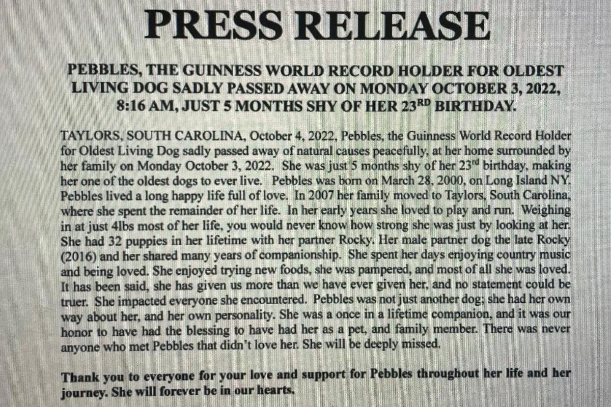 “Peebles, dona do recorde mundial de cachorrinha mais velha do mundo, infelizmente faleceu na segunda-feira, dia 3 de outubro de 2022, às 8h16 da manhã. Peebles faleceu de causas naturais pacificamente em sua casa e cercada por sua família”, colocaram em comunicado.