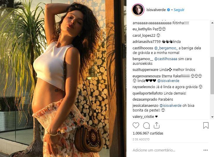 Dias antes, ela publicou outra imagem com o barrigão de fora, dessa vez usando uma saia longa e top. Ao fundo, paisagem de muito verde e plantas. Na legenda, a atriz entrega uma de suas paixões: “Alma solar”.