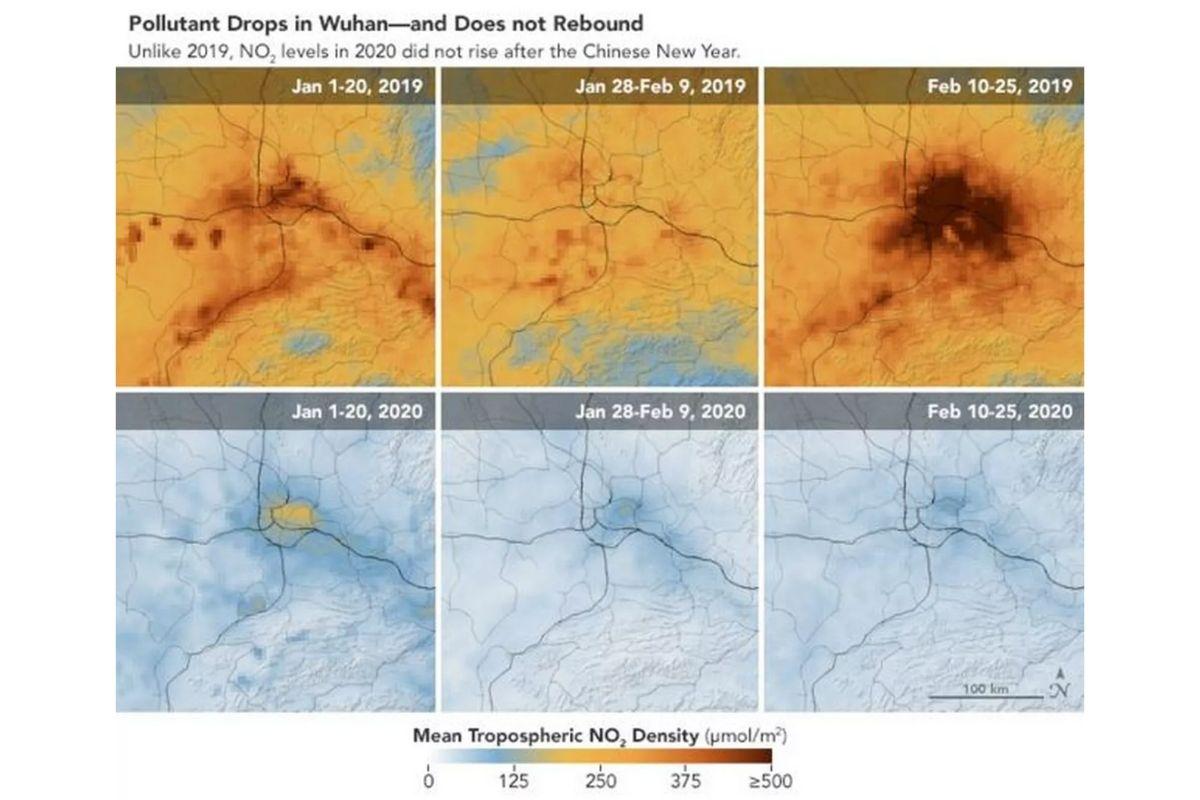 Os cientistas da NASA informaram que notaram primeiramente a mudança em Wuhan, cidade onde o vírus apareceu, quando a redução nos níveis de dióxido puderam ser registradas pelos satélites. O gás é considerado nocivo e está presente em veículos automotores e instalações industriais.