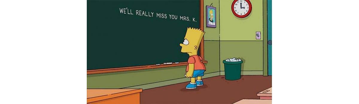 No dia 03 de novembro, domingo passado, Os Simpsons fizeram uma homenagem a Mrs. K com o famoso quadro negro e a frase escrita a giz pelo Bart “Sentiremos sua falta Senhorita Krabappel”.