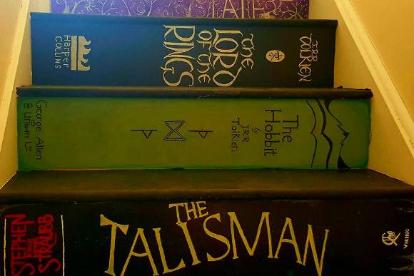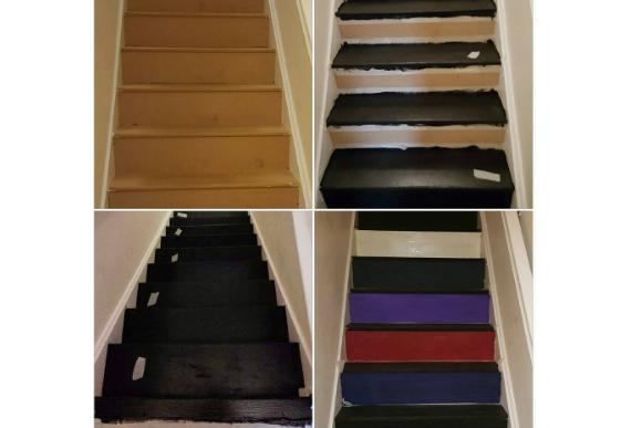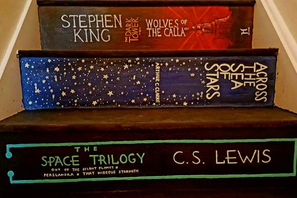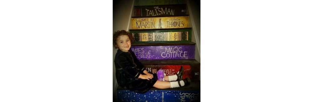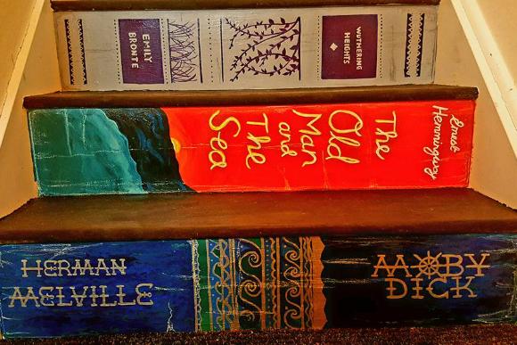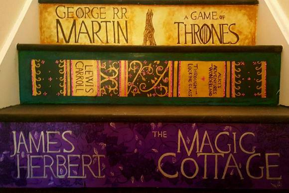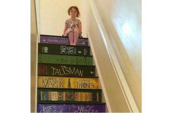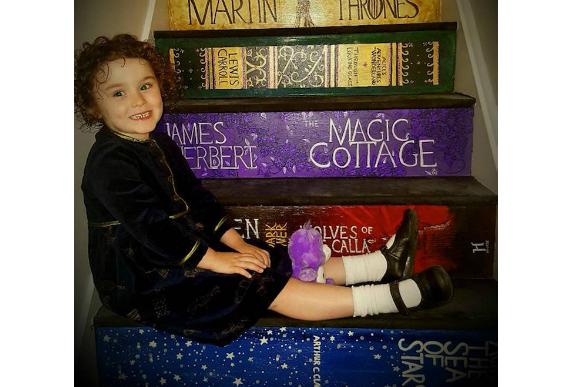 Combinando muita personalidade e tintas, pincéis e mão na massa, eles transformaram a escada da casa em um caminho completo e colorido para que a pequena Abigail entrasse no universo mágico da literatura.