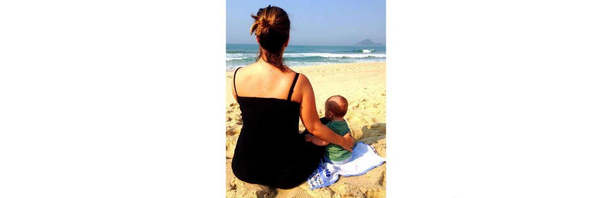 Paloma Duarte acordou cedo para levar o filho Antônio, de 4 meses, à praia nesta segunda-feira, 19.