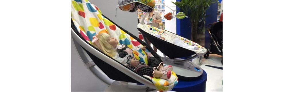 Os produtos para bebês também vêm com novidades automatizadas. A 4moms, da Brasbaby, apresentou dois destaques: o MamaRoo, uma cadeira que embala o bebê em cinco movimentos diferentes – um deles simulando o balanço de um passeio de automóvel; e o carrinho Origami, que se monta e desmonta sozinho, ao apertar de um botão – e com bateria que acumula a energia gerada pelo movimento do passeio e pode ser usada para carregar um celular enquanto se passeia com o bebê.