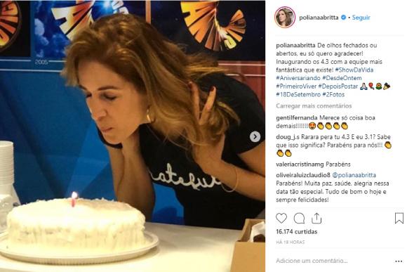 Na imagem Poliana agradece por mais um ano. “Com a casa florida de gente amada e meus filhotes dentro do meu abraço… assim abri os 4.3 ontem, dia 18! Agradecendo sempre! E cheia de fé na vida”