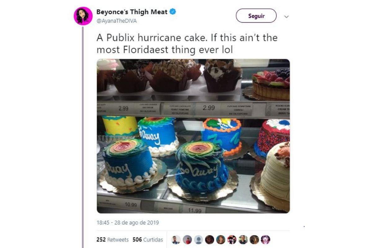 A rede de supermercados Publix, na Flórida, está recebendo uma enxurrada de comentários negativos nas redes sociais, pelo departamento de padaria do estabelecimento estar produzindo bolos no formato do furacão Dorian, que ocasionou na perda de diversas moradias e vítimas. As pessoas ao visitarem o estabelecimento para comprar suprimentos, água, lanternas e pilhas, se surpreenderam com o bolo na vitrine.