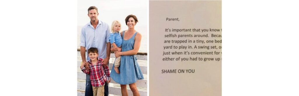 O casal Mike e Kelly esté criando os filhos de 4 e 2 anos anos em um apartamento a poucos passos de distância de uma praia em San Diego, na Califórnia. Morar perto do mar é o sonho de muita gente, mas os vizinhos dessa família não acham apropriado para crianças. Então, eles se acharam no direito de mandar uma carta para Mike e Kelly dizendo que eles eram pais egoístas.