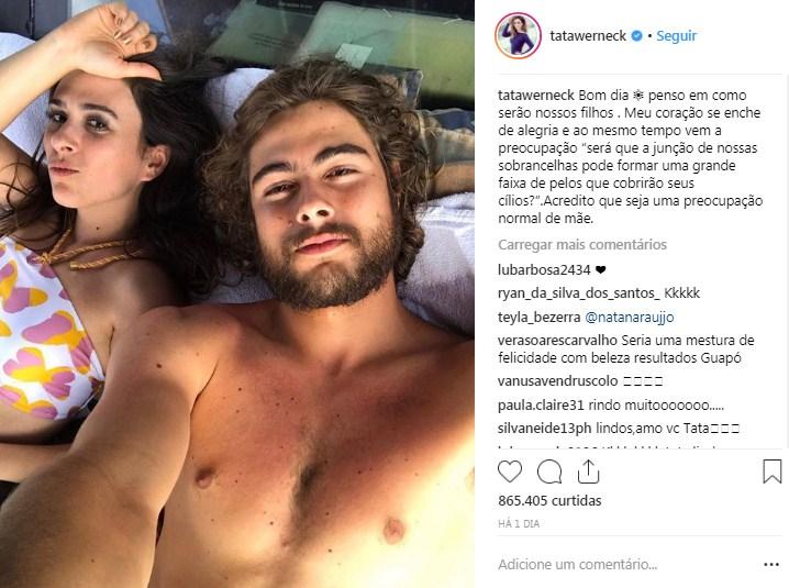 Tata Werneck, na última quarta-feira (19), publicou uma foto ao lado do namorado, Rafael Vitti, de quem está noiva desde o início de janeiro deste ano, para imaginar como será o futuro bebê do casal. Como sempre, a apresentadora usou o senso de humor para compor a legenda. Os dois estão deitados na foto postada em seu perfil do Instagram, com mais de 24 milhões de seguidores.