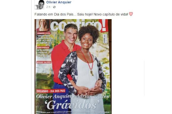 O Dia dos Pais do próximo domingo será ainda mais especial para Olivier Anquier. O chef anunciou hoje em sua página no Facebook que sua esposa, Adriana Alves, está grávida. “Novo capítulo de vida”, comemorou o chef na legenda da publicação. Ele também é pai de dois filhos do casamento com a atriz Débora Bloch.