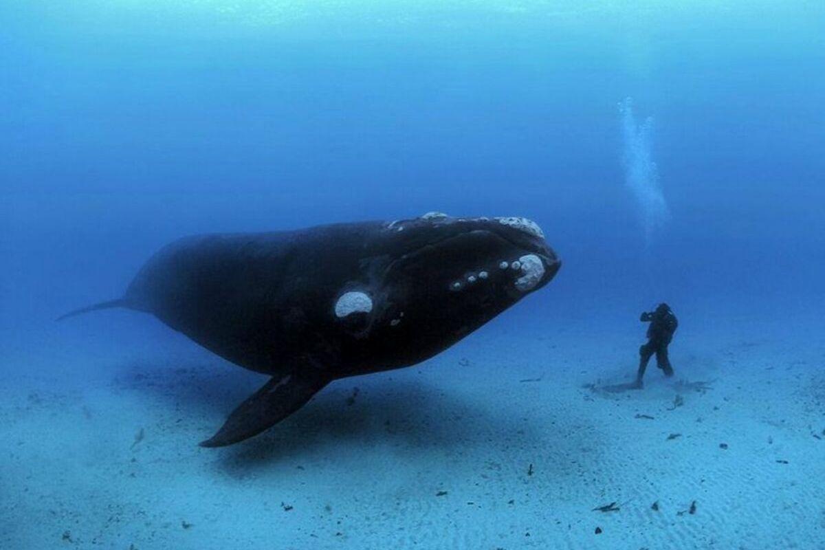 E, por fim, uma baleia ao lado de um ser humano. Imagine só a sensação de nadar ao lado dessa criatura!