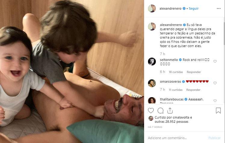 Na primeira publicação, Alexandre aparece brincando com os filhos e escreveu na legenda: “Eu só tava querendo pegar a língua deles pra temperar o feijão e um pedacinho da orelha pra sobremesa. Não é justo quando os filhos não deixam a gente fazer o que quiser com eles”, brincou.
