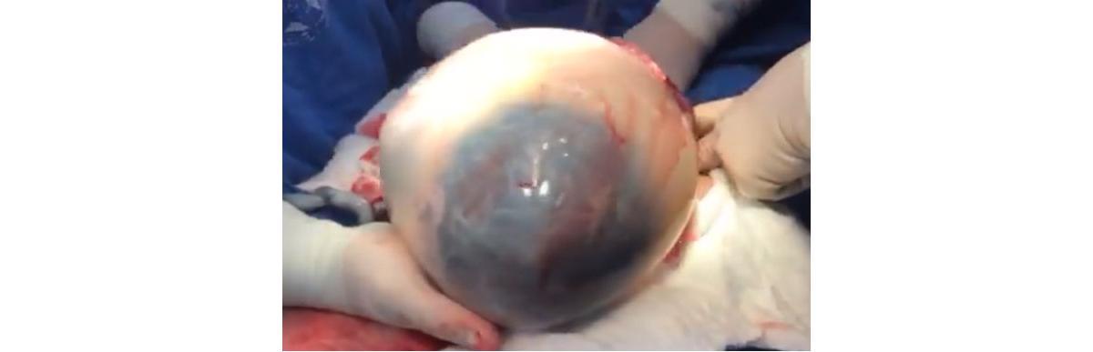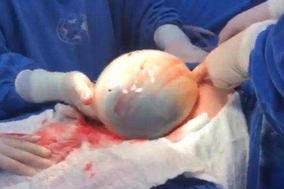 A equipe já tinha retirado o primeiro bebê do útero, o menino, há alguns minutos, quando, durante a retirada da menina, notaram que ela estava dentro da bolsa, envolta no líquido amniótico. Foi então que começaram a gravar o parto.