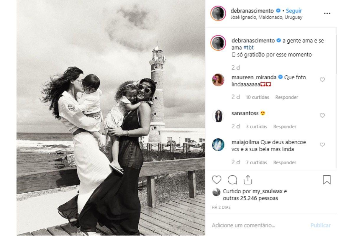 Na foto, tirada no Uruguay, Débora aparece segurando Bella no colo ao lado da amiga Giselle Alves, jornalista e também com a filha Pietra nos braços. Na legenda, ela escreveu: “A gente ama e se ama. Só gratidão por esse momento”.