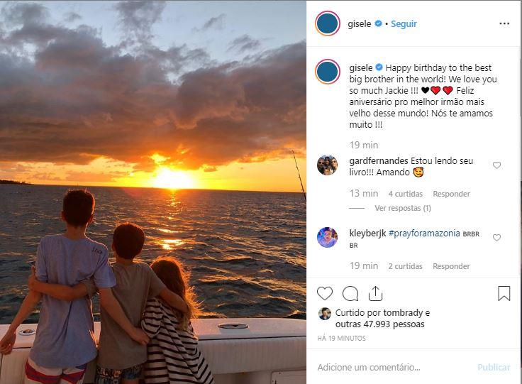 “Feliz aniversário pro melhor irmão mais velho desse mundo! Nós te amamos muito”, declarou Gisele. Na publicação, muitos seguidores elogiaram a foto e se emocionaram com a declaração da modelo. “Nossos pequenos raios de sol”, comentou o marido Tom Brady. “Família linda! Parabéns ao Jackie, muita luz e saúde”, disse uma seguidora. “Ele deve adorar ter você como madrasta, você é uma inspiração”, comentou outra fã.