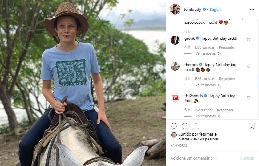 Os seguidores de Tom Brady também deixaram muitos comentários desejando parabéns ao menino e enfatizando como ele se parece com o pai. “Feliz aniversário, Jack!”, comentou o ator Dwayne “The Rock”. “Ele é tão parecido com você!”, disse uma fã. “Vocês são iguais, ele é um menino de sorte por ter um pai como você!”, disse outro seguidor.