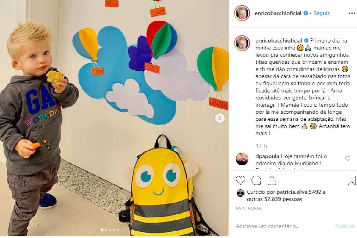 Enrico Bacchi, filho de Karina Bacchi, está vivendo uma nova fase muito especial. O menino começou a estudar! Como foi matriculado em uma escola americana, iniciou o ano letivo agora no final de julho. E a criança já foi logo correr para o Instagram contar como foi a experiência.