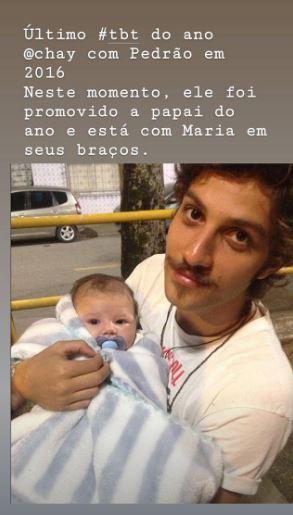 A mãe de Chay Suede também publicou uma foto relembrando um momento especial do filho. “Último tbt do ano. Chay com Pedrão em 2016. Neste momento, ele foi promovido a papai do ano e está com Maria em seus braços”, declarou Herica Godoy nos stories do Instagram.