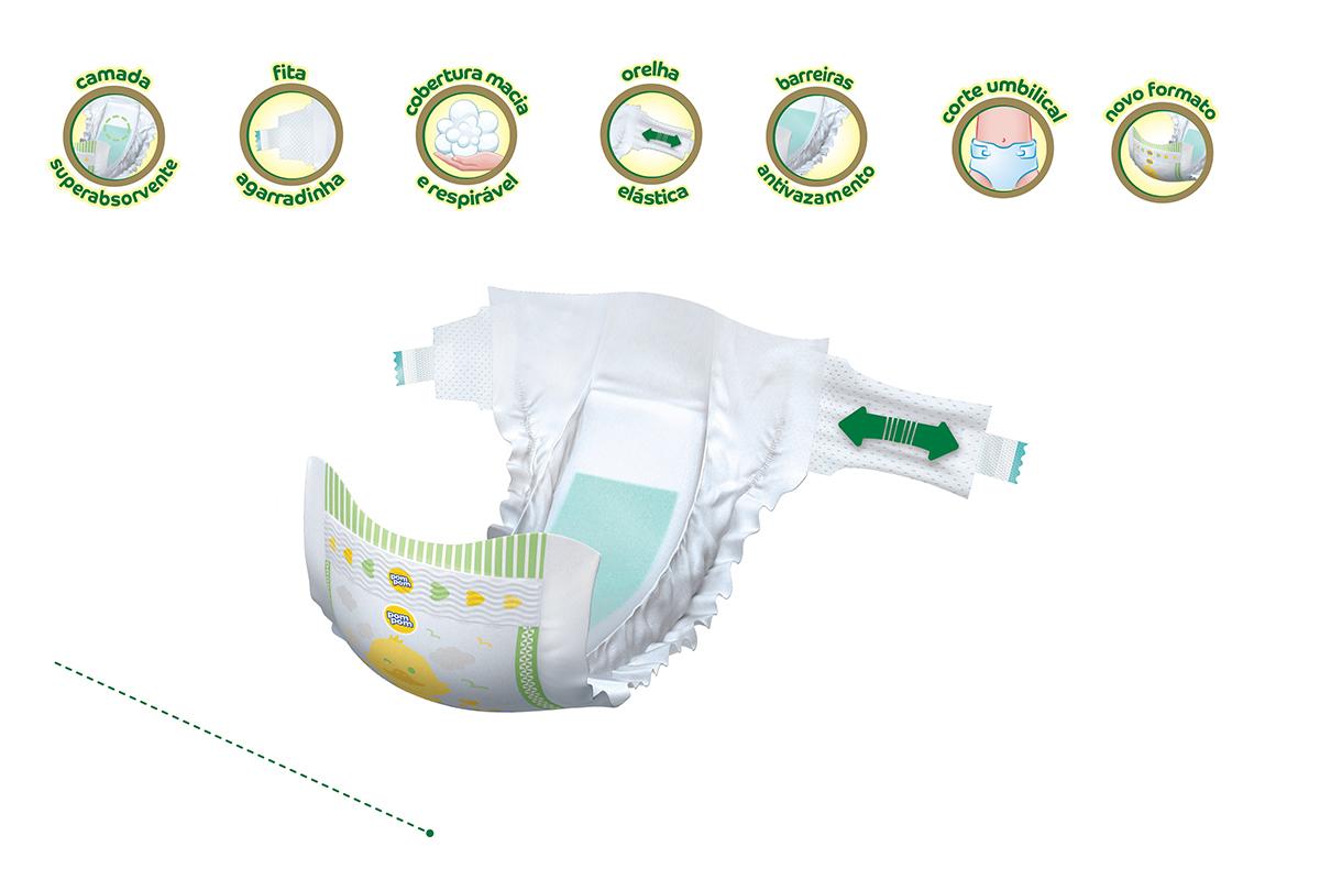 – fralda com novo formato que serve nos bebês de até 5kg.