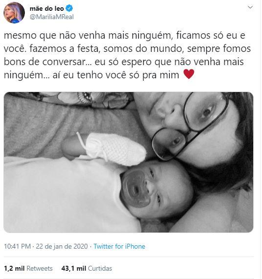 Marília Mendonça está curtindo cada momento da maternidade. Na quarta-feira, 22 de janeiro, a cantora se declarou mais uma vez para o filho no Twitter. Na publicação, Marília postou uma foto deitada ao lado do filho e se declarou usando a música “Mais Ninguém” da Banda do Mar.