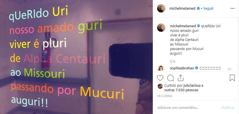 Em seu perfil do Instagram, Michel publicou uma foto da plaquinha que estava decorando o quarto da maternidade de Uri. “qUeRIdo Uri, nosso amado guri, viver é pluri, de Alpha Centauri ao Missouri, passando por Mucuri, auguri!”, disse Michel na legenda da publicação.