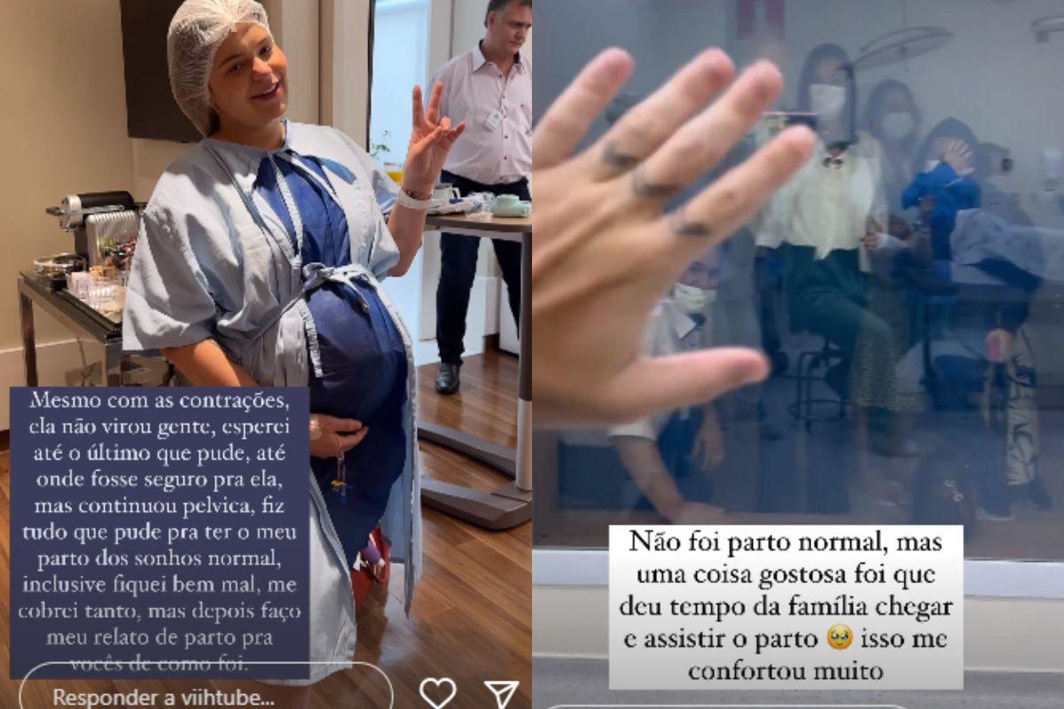 A influenciadora comentou que o parto não saiu como ela planejava, pois a Lua estava sentada e acabou não virando. ”Não foi parto normal, mas uma coisa gostosa foi que deu tempo da família chegar e assistir o parto, isso me confortou muito”. ”Eu tinha muito mdeo da cesária, por isso queria tanto que ela virasse, mas no relato de parto conto como foi minha experiência”, completou Viih Tube