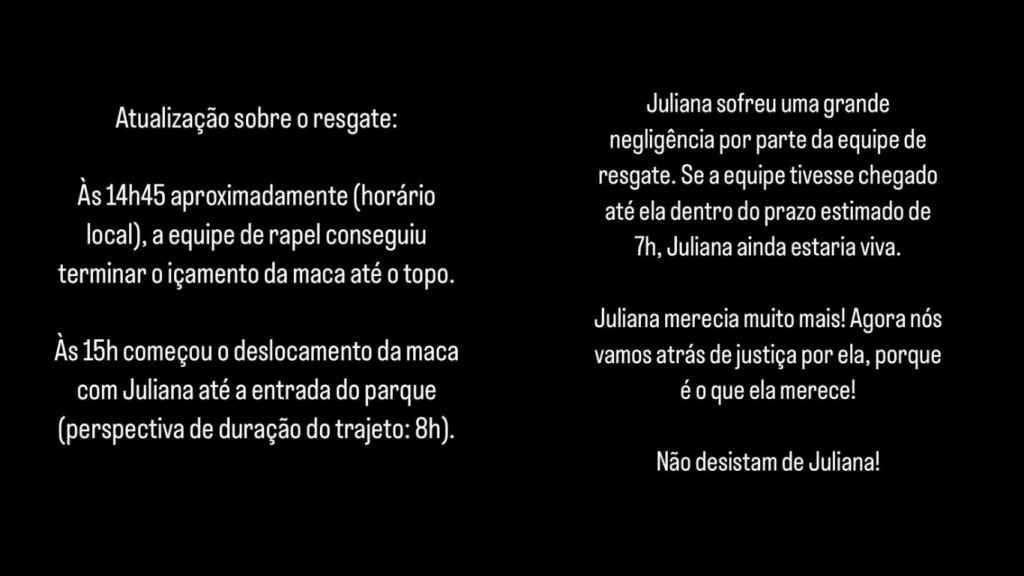 “Juliana sofreu uma grande negligência por parte da equipe de resgate. Se a equipe tivesse chegado até ela dentro do prazo estimado Juliana ainda estaria viva.”