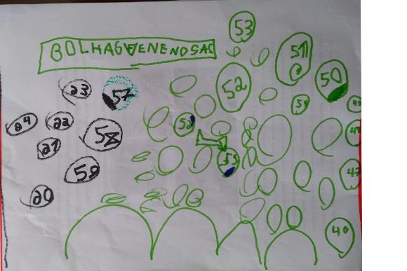 Um jogo de tabuleiro é construído enquanto se lê o livro. Jogo das bolhas do peixe, jogo das bolhas venenosas do peixe. B-o, bo. Lha, como é lha, mãe? L-h-a, lha, n-h-a, nha. Lha, nha, lha, lha, lha. N-h-a e l-h-a se parecem. Um tabuleiro simples, feito à mão, todo pintado e cheio de narrativas da experiência, um dado a jogar e estratégias de acontecimentos para alguns dos muitos números percorridos no jogo.