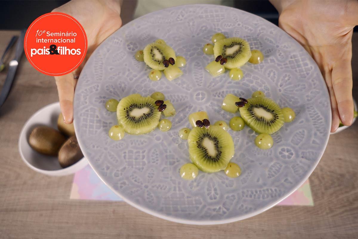 – Depois que você cortar o kiwi em rodelas, o segundo passo é cortar as uvas em pedaços, para fazer as patinhas da tartaruga.