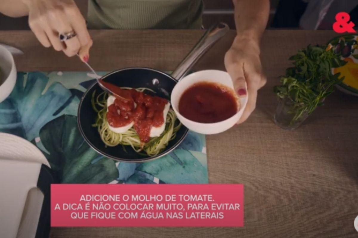 1. Passe as abobrinhas por um cortador de legumes em tiras finas para que fiquem no formato de espaguete e reserve