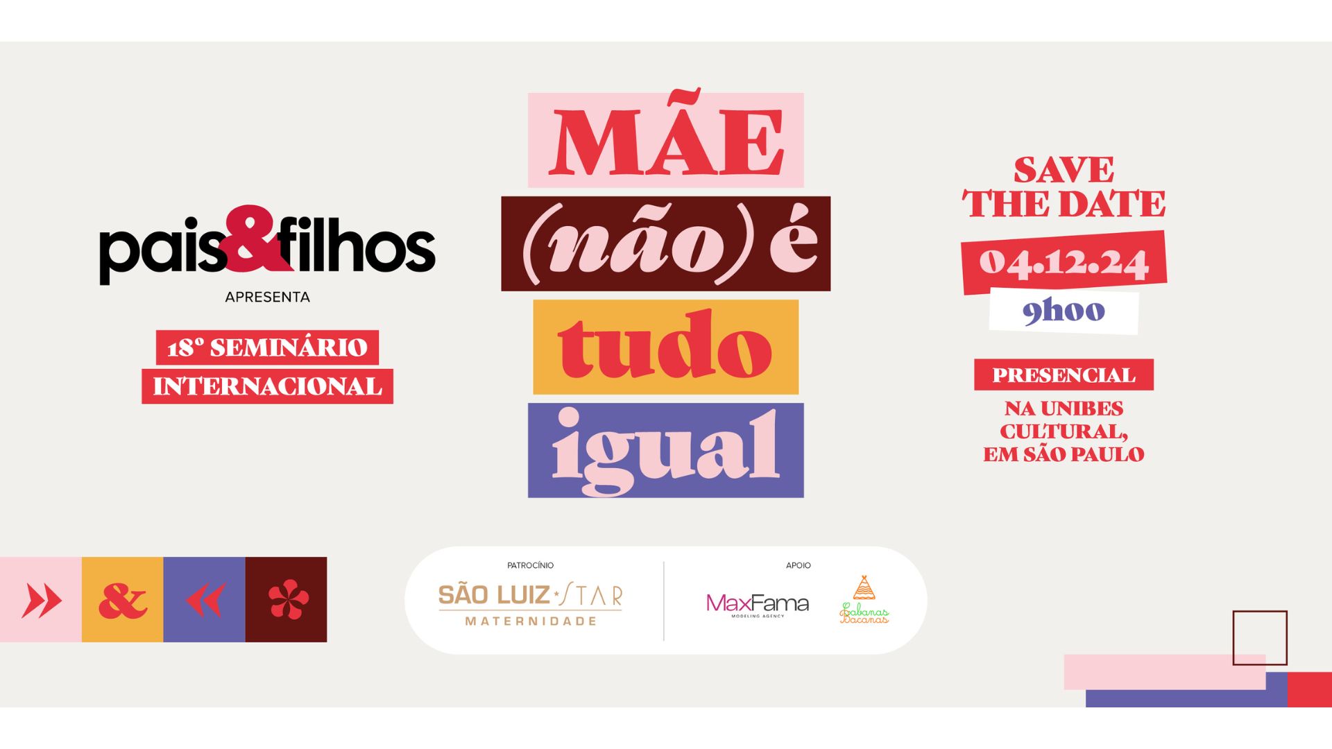 O 18º Seminário Internacional Pais&Filhos – Mãe (não) é tudo igual acontece no dia 4 de dezembro, direto da Unibes Cultural, localizada na rua Oscar Freire, n°2500 em São Paulo, com um dia cheio de palestras, bate-papos e mesa-redonda. Entre os palestrantes, estão nomes como Marcos Piangers, Maya Eigenmann e Dr. Wimer Bottura Junior.