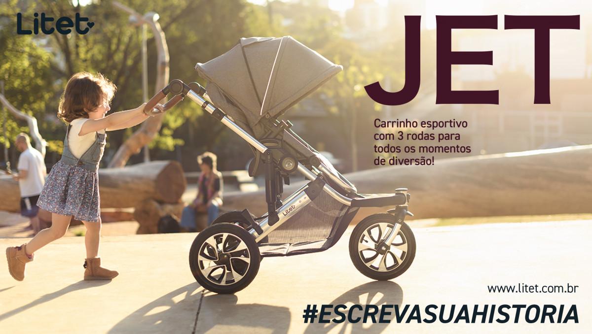 Litet: 1 carrinho Jet — esportivo com três rodas de mais de 30cm de diâmetro, robusto e resistente com amortecimento nas três rodas para passar por qualquer tipo de terreno mantendo o conforto do bebê. Tem cobertura ajustável e comprida, permitindo um cochilo tranquilo para o bebê. Compatível com o Bebê conforto Litet. De 0 a 15kg.
