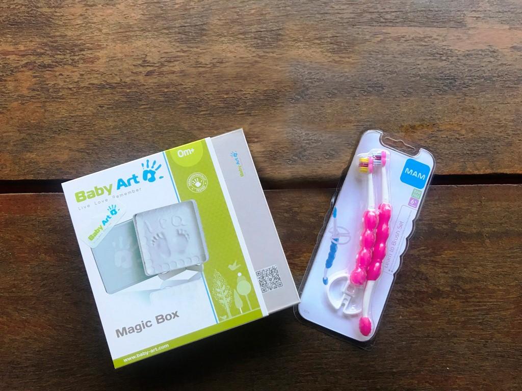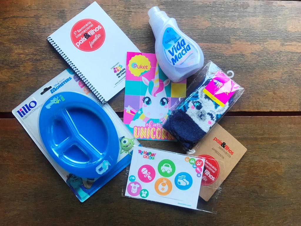 Entre os brindes estão fraldas, creme de assaduras, sabonete líquido e lenços umedecidos da Huggies; um par de meias e folder da Puket; pratinho infantil com divisórias da Lillo; amaciante de roupas da Casa KM; caderninho da Pais&Filhos em parceria com a Dentista de Criança; magic box da Infanti; porta-retrato da Ri Happy; caixa de leite de 1l da Italac; um conjunto de escova de dentes da MAM; uma caixa de bolinho Minichef e uma caixa de bolinho brownie, da Jacquet; uma revista, bloquinho e caneta da Pais&Filhos.