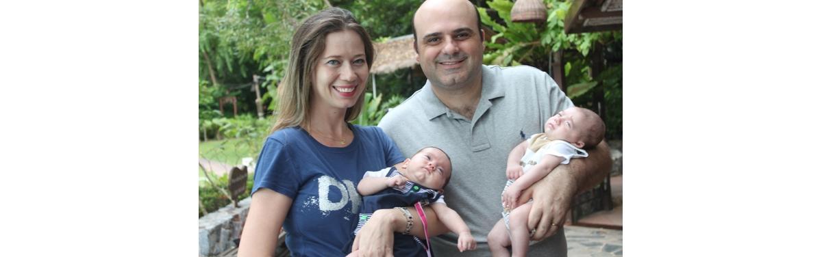 Com 32 anos, decidi tentar a fertilização de novo, na Coreia, onde estavam nossos embriões congelados. O médico quis que eu colocasse três embriões e aceitamos. Dez dias depois, a resposta: GRÁVIDA! E de gêmeos.Foi uma alegria e uma preocupação ao mesmo tempo. Se a gravidez já era de risco, imagine de gêmeos.