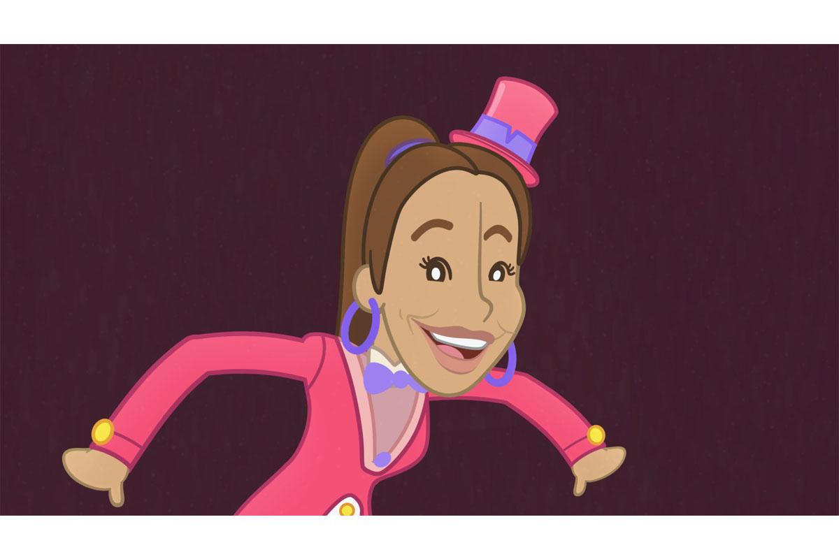 Ela está com um look bem circense, calça branca e um meio-fraque cor de rosa. Ivete ganhou, inclusive, uma típica cartola de circo. Mas o sorriso e os traços não enganam, ela ainda possui o carisma e o os mesmos traços, mesmo sendo um desenho.